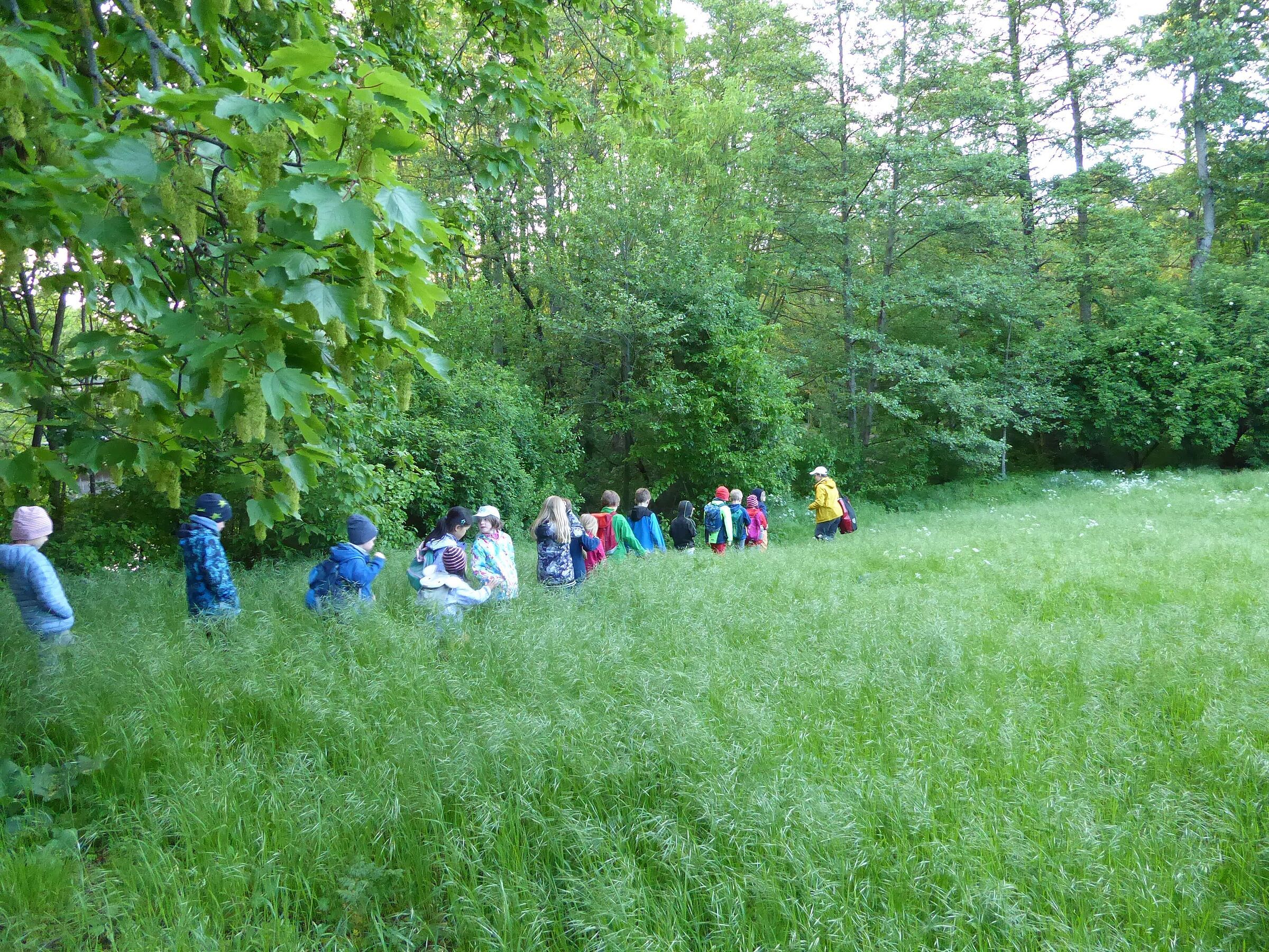 Rund um die Wöhrder Wiese gingen die angehenden Artenkennerkids auf die Suche nach Biberspuren und ließen sich dabei auch von hohem nassem Gras nicht abschrecken. Diejenigen, die bis zum Schluss ausharrten, konnten ihn tatsächlich noch bewundern: Vor der Brücke am Biberschild aalte sich der Biber im Wasser, posierte für die Fotografen in der Dämmerung ... und tauchte ab.