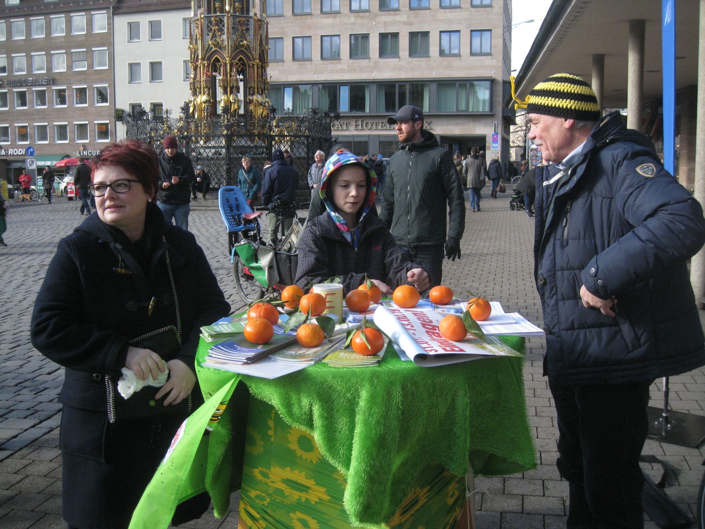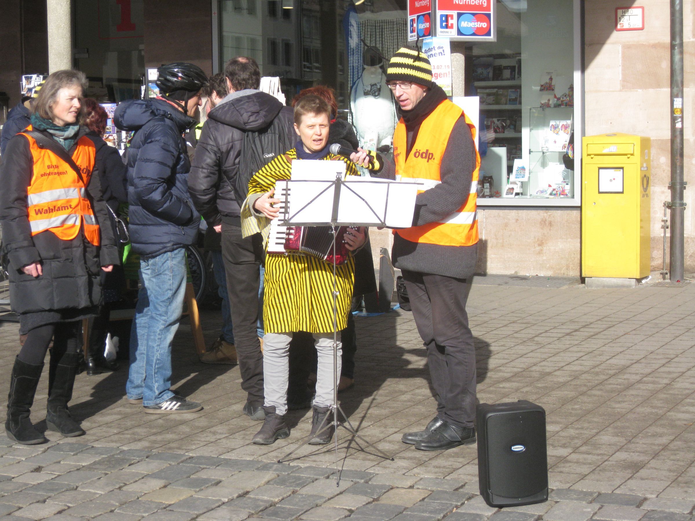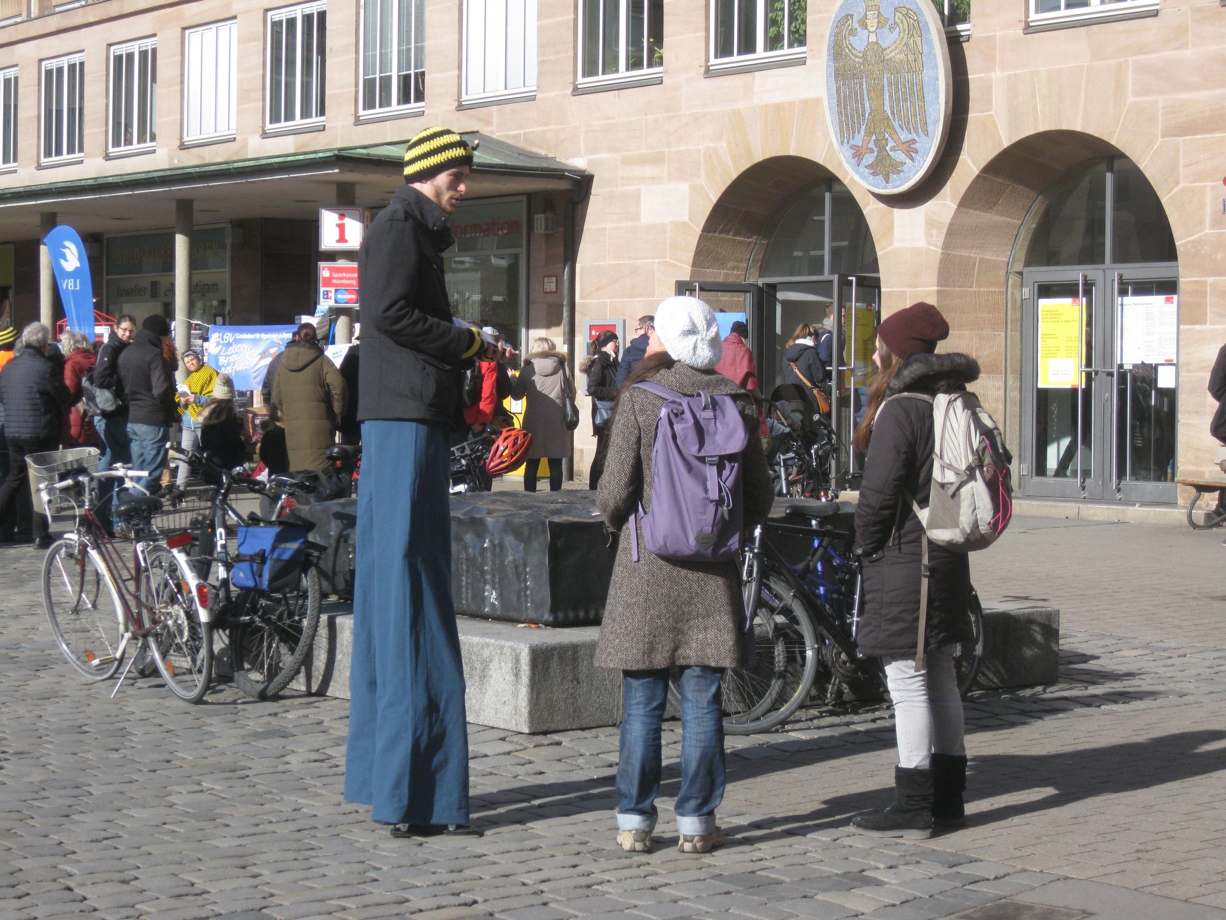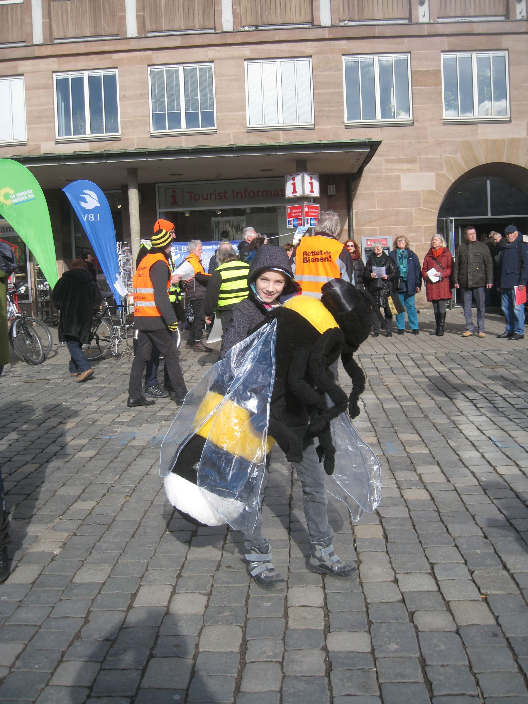 Am letzten Wochenende hatten die Eintragungsstätten Rathaus, Wahlamt, Südpunkt und Langwasser am Samstag und Sonntag von 11 bis 15 Uhr geöffnet. Aus diesem Anlass veranstaltete das lokale Aktionsbündnis am Samstag ein „fröhlich-informatives Treiben“ vor dem Nürnberger Rathaus. Schon bevor sich dessen Türen öffneten, hatten sich lange Schlangen von Eintragungswilligen gebildet. Dank der künstlerischen Unterstützung durch den Nürnberger Gewerkschaftschor Auftakt, Beatrix Springer am Akkordeon und Diplom-Clown Markus Just konnte diese Wartezeit jedoch auf angenehme Weise verkürzt werden. Viele Passanten nutzten außerdem die Gelegenheit für ein Gespräch über das Volksbegehren und das Thema Artensterben bzw. Artenvielfalt im Allgemeinen. Herzlichen Dank auch für die vielen aufmunternden Kommentare im Namen der „echten“ Bienen und ihrer menschlichen Kollegen, die seit nun fast zwei Wochen unermüdlich bei jeder Witterung als Rathauslotsen auf das Volksbegehren aufmerksam machen!