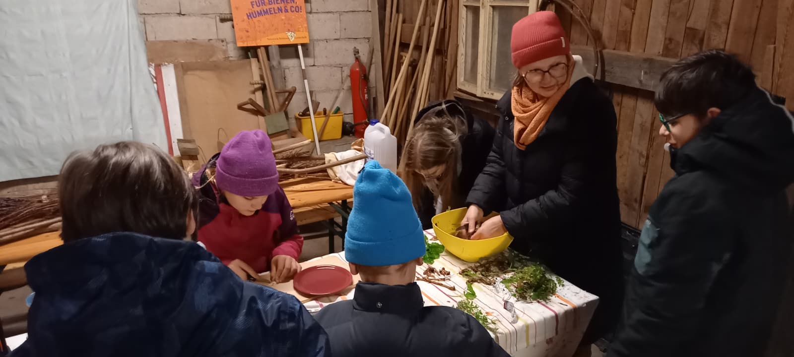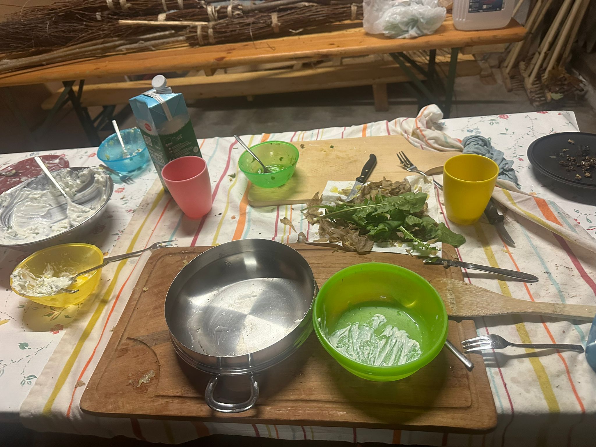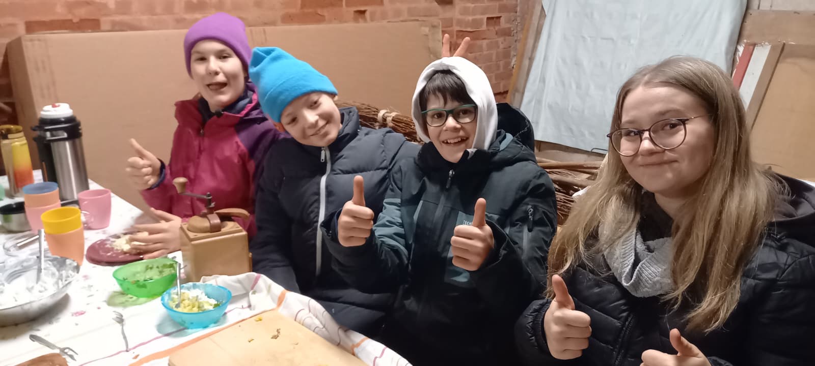Um bei der Kälte warm zu werden, haben wir auf der Schmetterlingswiese Grashaufen zusammengeharkt. Das ist wichtig, um die Wiese abzumagern. Ein Auftrag, den der BUND Naturschutz in Stein auf sich genommen hat. Hierbei haben wir gerne mitgeholfen und hatten eine Menge Spaß dabei. Anschließend ging es ans Kräutersuchen. Viel Zeit blieb uns dafür nicht, weil es bereits früh dunkel wurde. Wir zauberten Kartoffeln mit Kräuterquark! Zusammen haben wir Löwenzahnwurzeln, Vogelmiere und Brennnesseln gefunden. Zwiebel und Knoblauch hatten wir mitgebracht. Während einige von uns noch weitersuchten, bereiteten die anderen die Kartoffeln und das kochende Wasser vor. Die Pausen haben wir genutzt, um alles Gefundene zu waschen und kleinzuschneiden. Zusammen mit Quark entstand ein gut schmeckender Kräuterdip für unsere Kartoffeln.