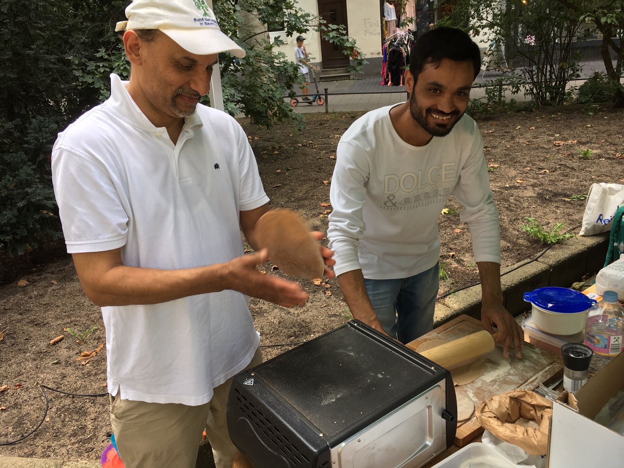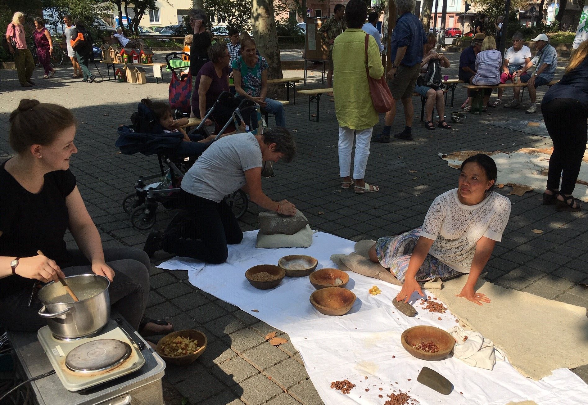 Wegen der Weite des Platzes ist es trotz der diesmal etwa 100 Besucher immer noch ein sehr gemütliches, „kleines“ Fest. Die von den Ehrenamtlichen mitgebrachten Kuchen waren bis zum Abend vollständig aufgebraucht, der Smoothiemixer von Kazumi Nakayama lief im Dauereinsatz und Sajid Qureshi von der Ahmadiyya-Gemeinde konnte beinahe im Akkord seine leckeren Fladenbrote zubereiten. Zum Glück hatte er sicherheitshalber auch Mehl von zu Hause mitgebracht, denn unsere Ernte hätte nicht ganz gereicht, zumindest waren wir mit dem Dreschen und Mahlen nicht schnell genug.