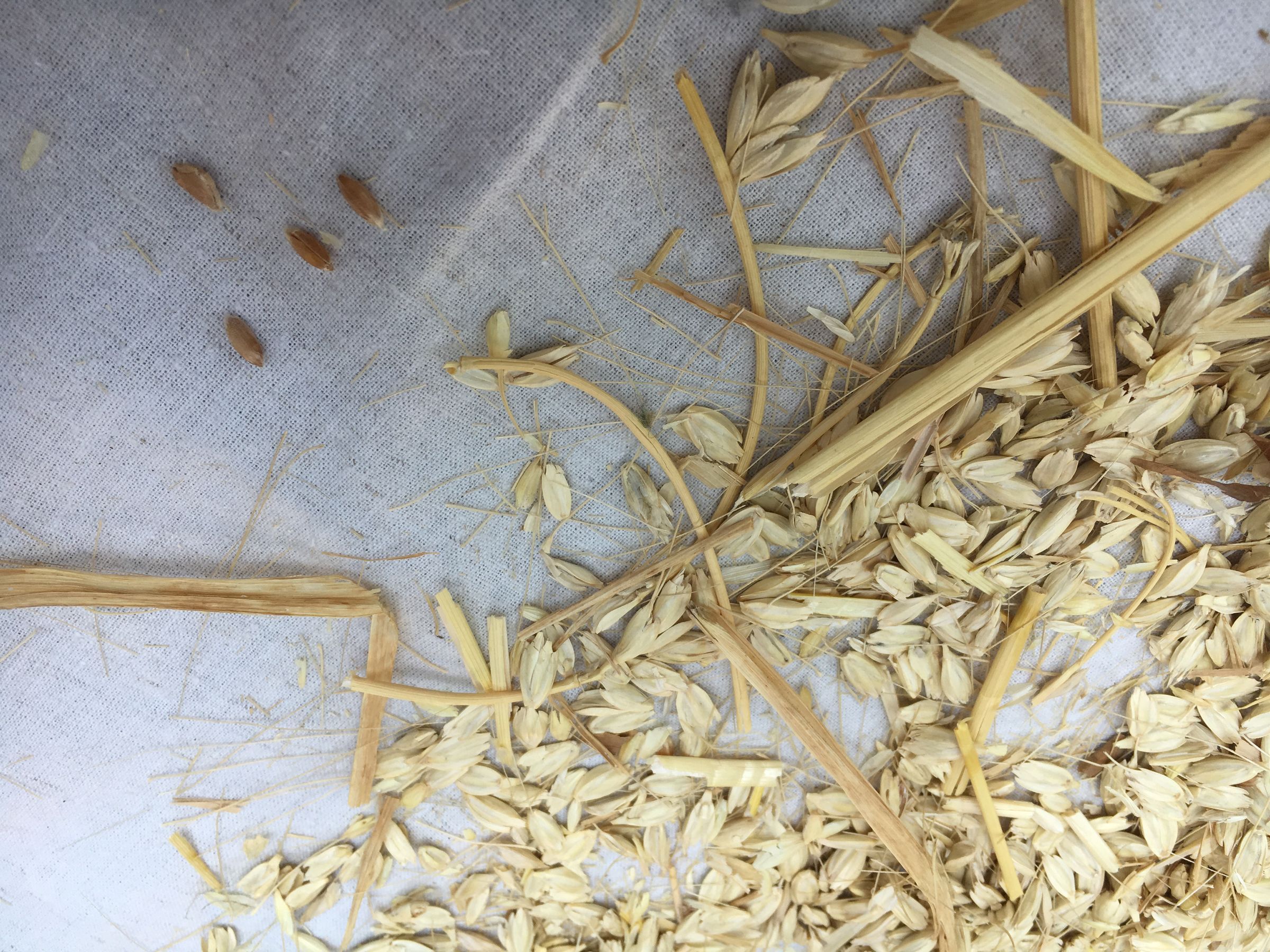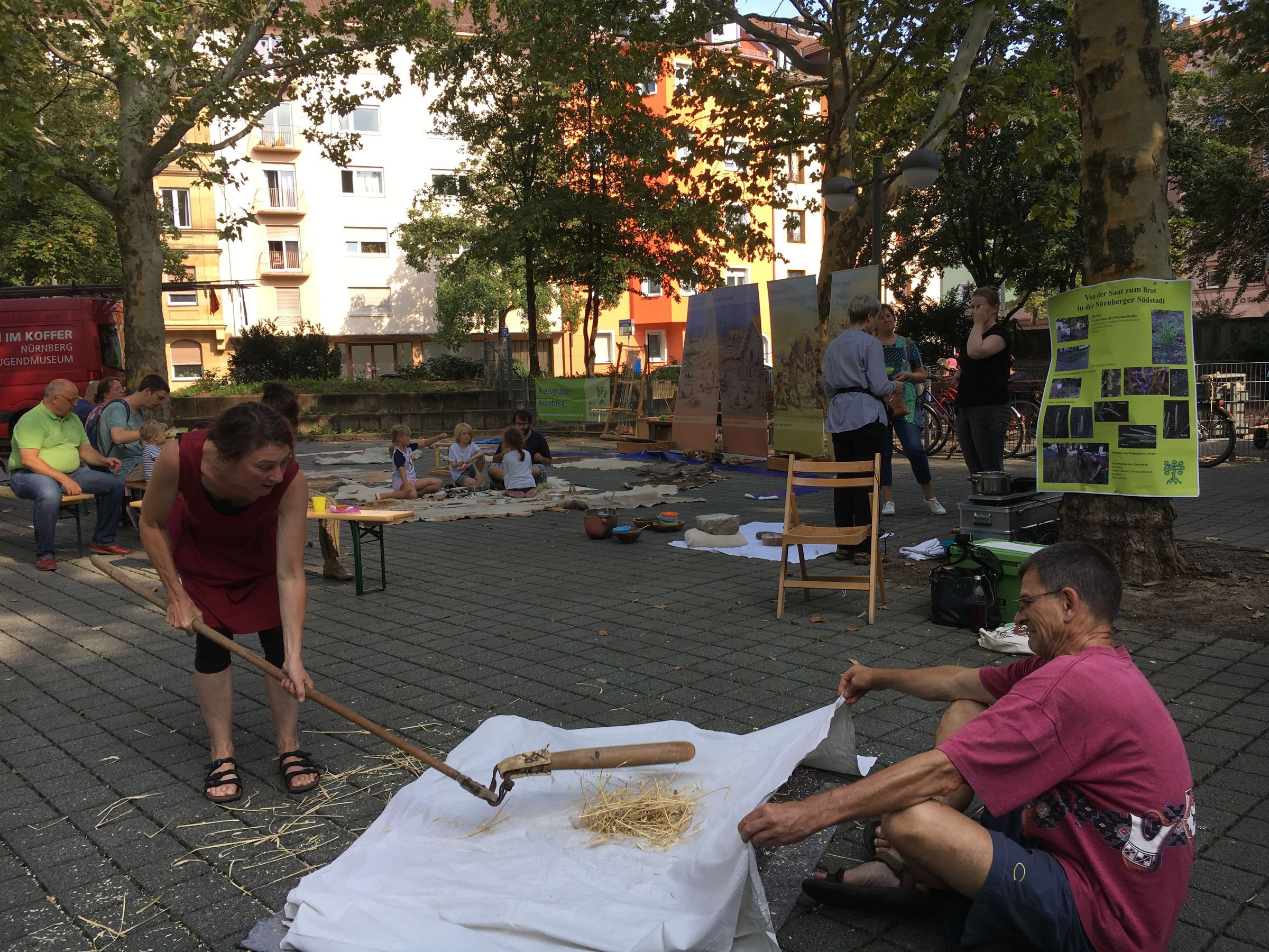 Das Verarbeiten des kürzlich geernteten Getreides war die Hauptattraktion des Tages. Viele Passanten blieben ganz spontan beim improvisierten Dreschplatz stehen und wollten ebenfalls ausprobieren, ob sie mit dem Dreschflegel umgehen konnten. Und manche waren sehr geschickt dabei; immer wieder gab es auch Leute, die das Dreschen von ihrer Kindheit her kannten und den anderen genau zeigen konnten, wie der Flegel gehandhabt wurde. Beim Trennen der Körner von der Spreu war Fantasie gefragt. Der mitgebrachte Blasebalg bündelte die Luft zu stark und war ungeeignet; ein großes Tablett erfüllte seinen Zweck sehr gut, die Armmuskulatur machte dabei aber schnell schlapp. Zwei Ehrenamtliche bliesen im Duett, was ebenfalls guten Erfolg brachte, aber nicht allzu lange durchzuhalten war. Gegen Abend hatte eine Mitbürgerin aus Indien ein Einsehen und erklärte, wie man es dort machte. Eigentlich gar nicht kompliziert.