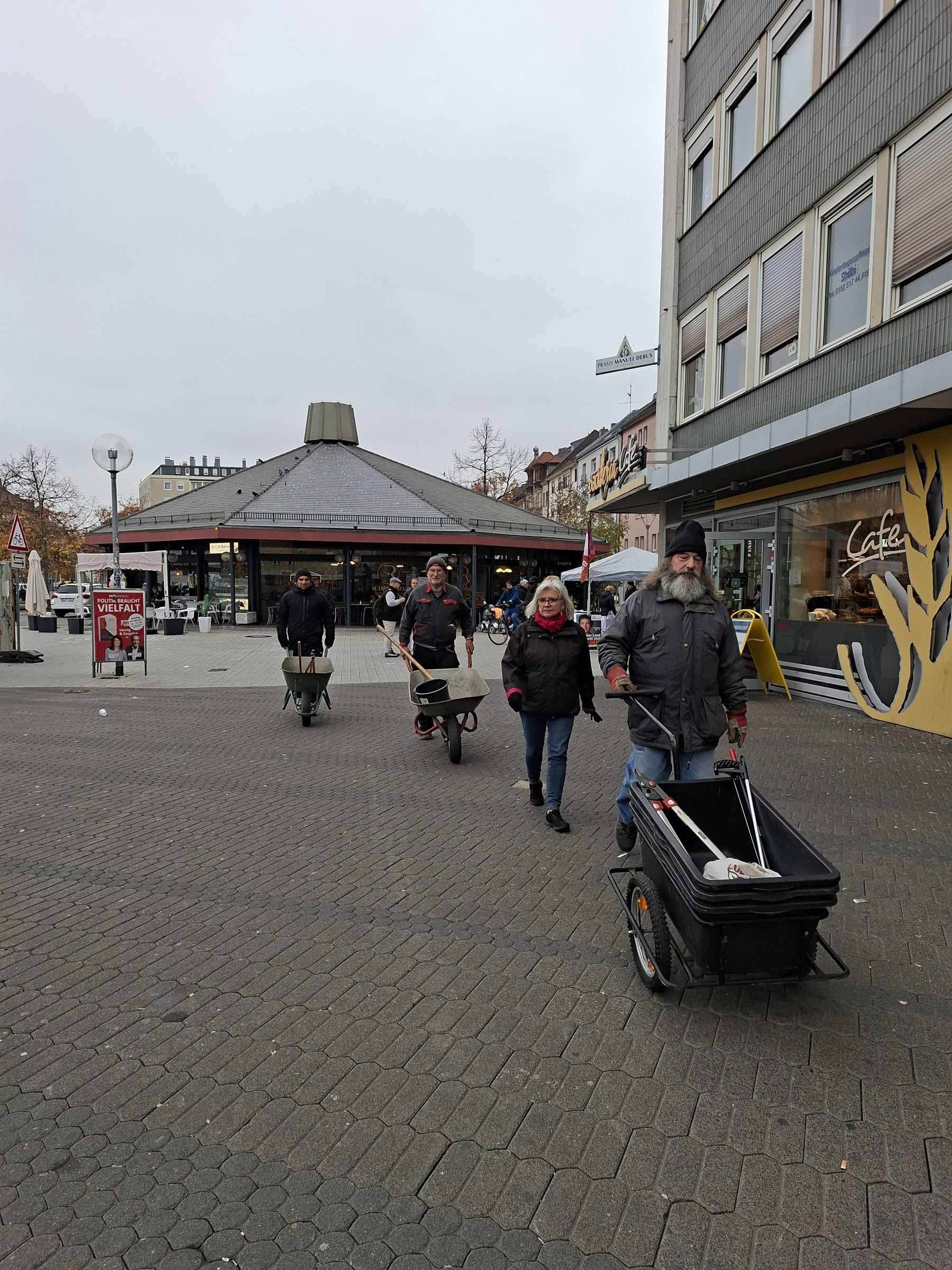 Man traf sich im Büro, um dann mit Schubkarren und Laubrechen über den Aufseßplatz zum südlichen Kopernikusplatz zu ziehen. Die beiden Beete sind sehr groß und es stehen viele Platanen auf dem Platz. Aber zum Glück waren acht Ortsgruppenmitglieder gekommen, und was uns besonders freute, ein Mitglied, das über den Wochensegler von unserer Aktion erfahren hatte und uns unterstützen wollte. Angespornt durch den Zuspruch einiger Passanten ging die Arbeit recht zügig voran. Sogar das BN-Werberteam, das in dieser Woche in Nürnberg war und Mitglieder für die Kreisgruppe warb, kam in seiner Mittagspause dazu, um ein wenig zu helfen. Ein Passant packte schließlich kurzentschlossen mit an und war dann bis zum Schluss dabei.