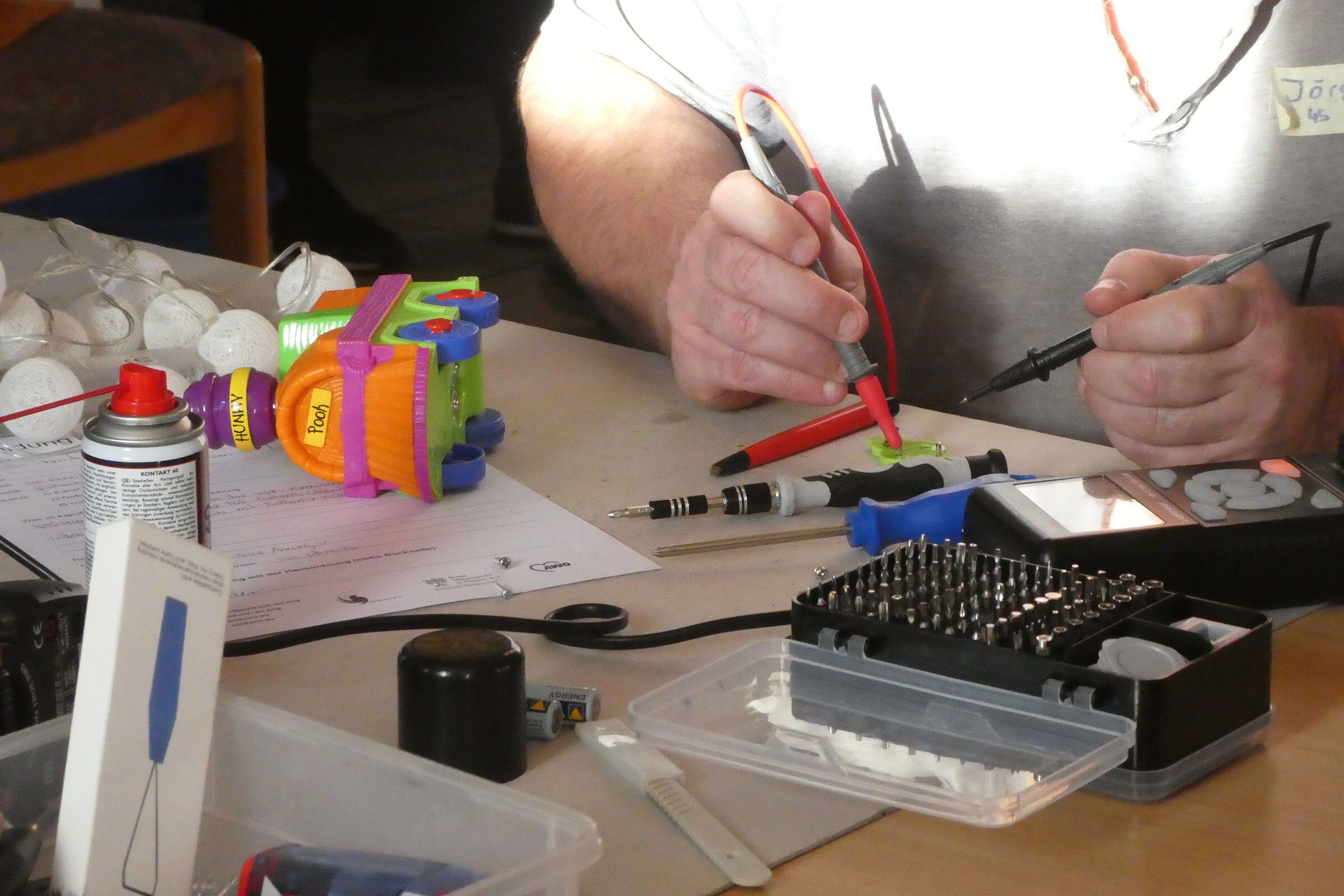Ein großes Dankeschön an alle Aktiven beim Katzwanger Repair-Nachmittag! 14 versierte Schrauber (inklusive einer Schrauberin) haben 82 Geräte unter die Lupe genommen, 38 Geräte wurden erfolgreich repariert, bei 20 Geräten hieß es „Reparatur nach Ersatzteilbeschaffung möglich“, bei 24 Geräten war die Diagnose „nicht mehr zu reparieren“, davon war bei zwei Geräten überhaupt keine Inspektion/Reparatur möglich, weil sich deren Gehäuse nicht zerstörungsfrei öffnen lassen.