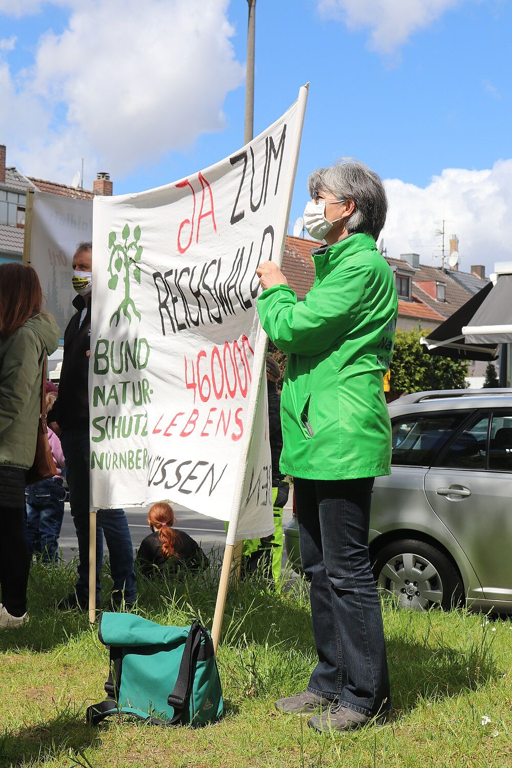 Die Rednerinnen und Redner sprachen sich für eine ökologische Verkehrswende aus, die nicht auf Kosten von Natur- und Klimaschutz geht. Für den BUND Naturschutz sprach Heide Frobel, 1. Vorsitzende der BN-Kreisgruppe Nürnberger Land. Der Schwerpunkt der Standortsuche für das ICE-Instandhaltungswerk liegt nämlich nicht mehr im Nürnberger Stadtgebiet, sondern im angrenzenden Landkreis.