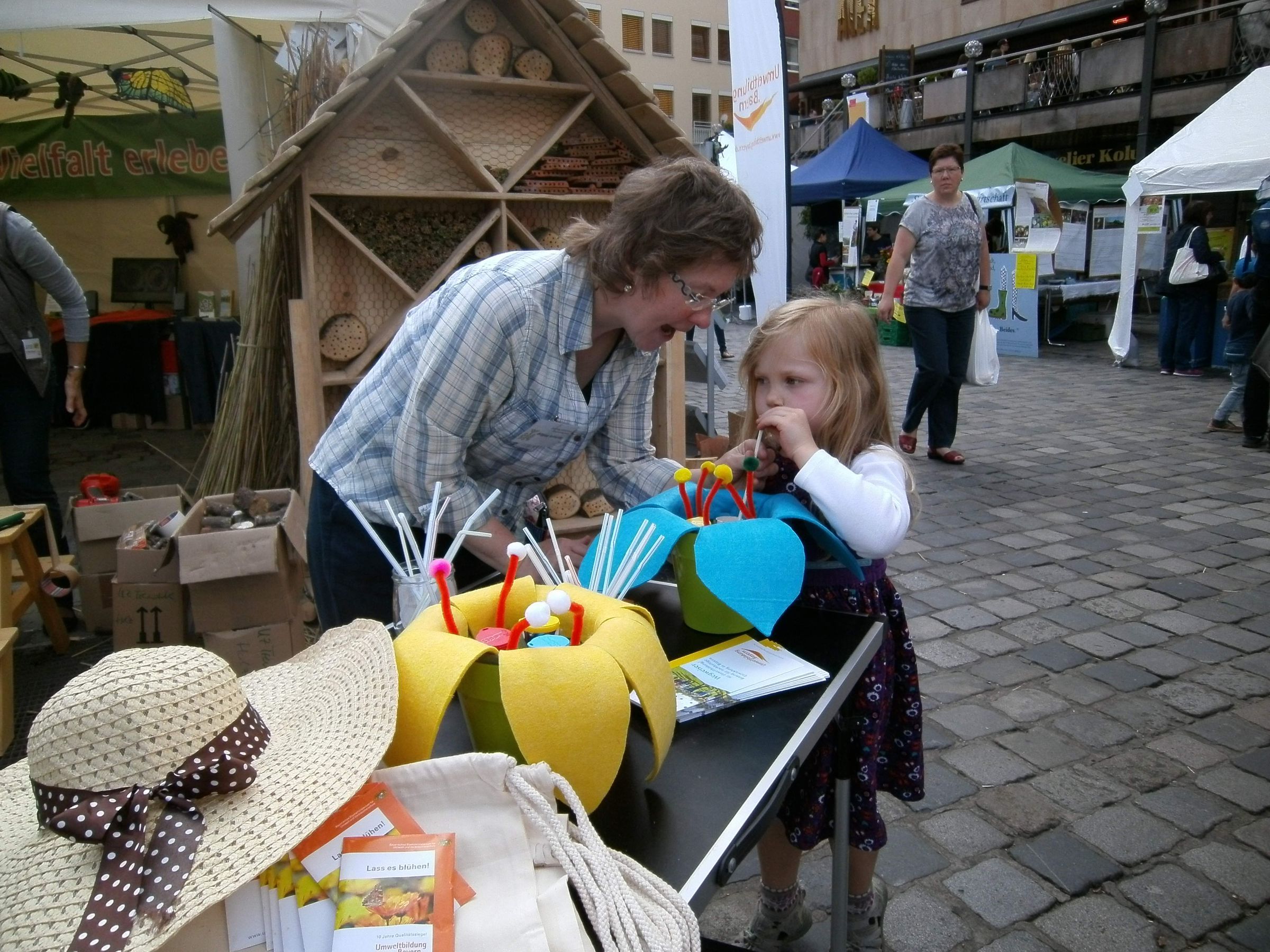 An einem bunten Stand luden wir zum Mitmachen und Ausprobieren ein: Kinder und Erwachsene halfen, ein Insektenhotel zu bestücken, bohrten Löcher in Holzstücke oder bündelten Schilfrohre. An nachgebauten Blütenmodellen konnten die Kinder erproben, wie Bienen und Schmetterlinge den Nektar aus den Blüten saugen – statt Nektar gab es Schokolinsen zur Belohnung! Ein Bienen-Quiz mit tollen Preisen war hochbegehrt. Zu gewinnen gab es bunte Nistkästen vom BUND Naturschutz, Insektenhotelbausätze und Pflanzenbestimmungsbücher. Auf der anderen Standseite luden Erde und Ton zum Matschen und zum Bau von Samenbomben ein. Bunt bepflanzte Einkaufskörbe wurden am Sonntagnachmittag auf der großen Bühne meistbietend versteigert.