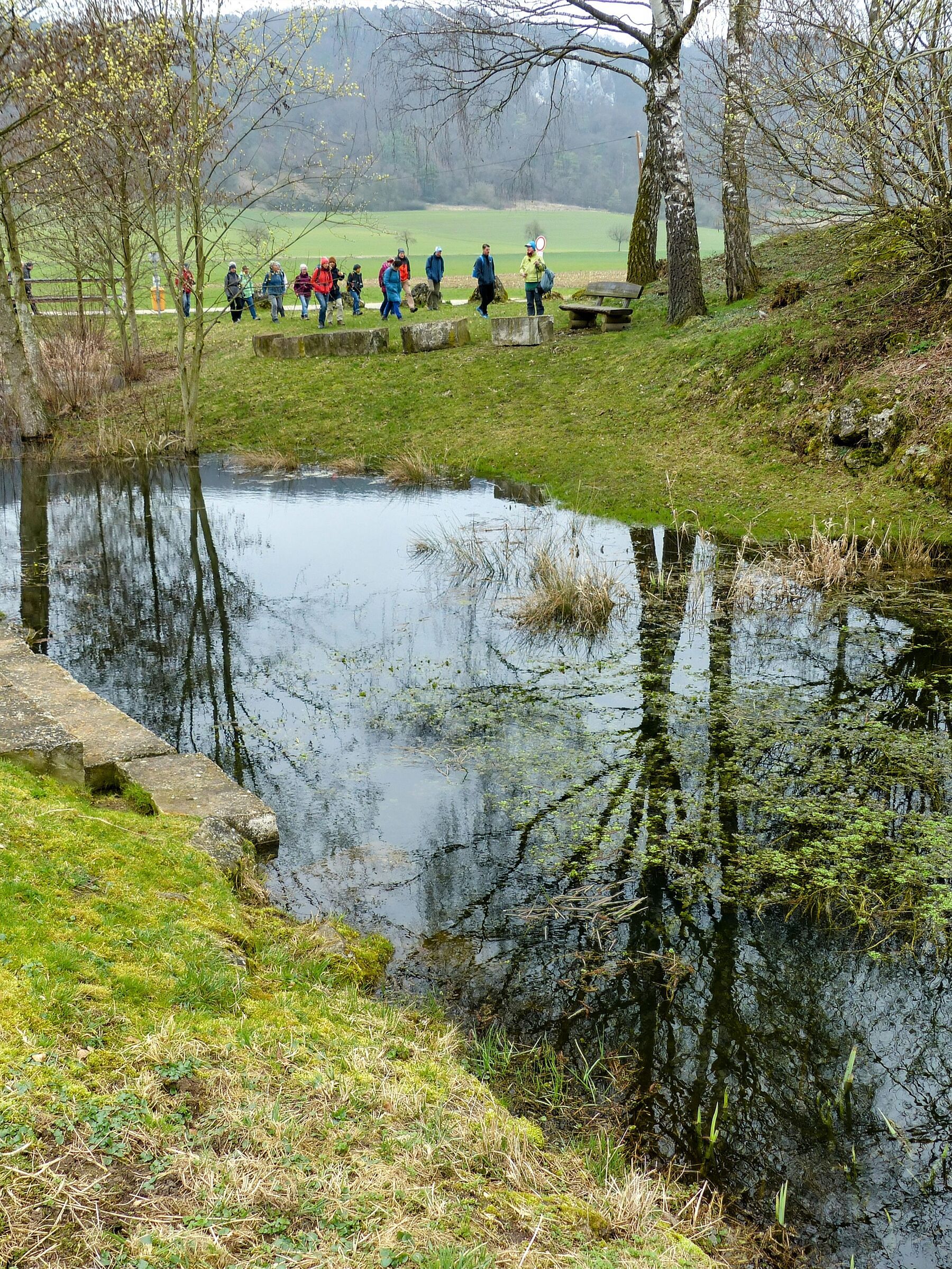 Wir fuhren mit Zug und Bus nach Wellheim. Dort, an der Schutterquelle, zu Füßen des Naturfreundehauses Konstein, erklärte Barbara Philipp die Entstehung dieser Landschaft vor 150 Millionen Jahren. Plastisch erläuterte sie die „Wannen“ (= Lagunen), an deren Rändern Schwämme und andere kalkbildende Tiere lebten, bis die mächtigen Kalkschichten irgendwann (vor 135 Millionen Jahren) herausgehoben wurden und erodierten. Sehr viel später, nach Auffaltung der Alpen, entstand nördlich davon ein Fluss, den wir Urdonau nennen. Sie floss durch das heutige mächtige Tal, wo sie sich mit dem Urmain vereinigte, denn der floss damals von Nord nach Süd. Woher wissen wir das? Die Flüsse haben allerlei Gestein mitgebracht, dessen Herkunft sich eindeutig zuordnen lässt.