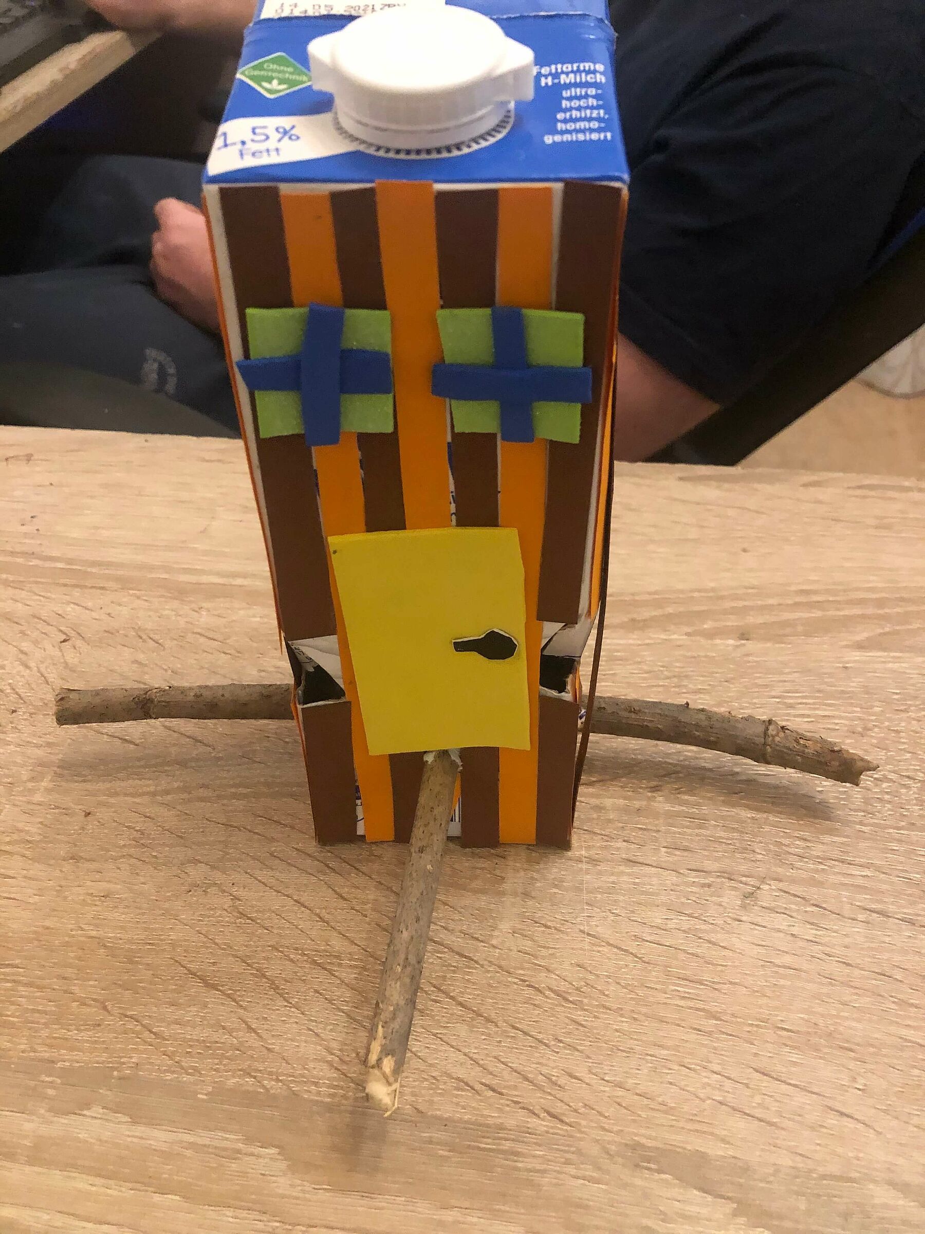 Deine Aufgabe: Baue eine Futterstation und fülle sie mit den Körnern aus deiner Ausrüstung. Dazu kannst du einfach einen leeren, ausgewaschenen und getrockneten Milchkarton hernehmen, den du an den Ecken vorsichtig einschneidest, die Ecken hineindrückst (siehe Anleitung) und an den Seiten Stecken zum Landen reinsteckst.
