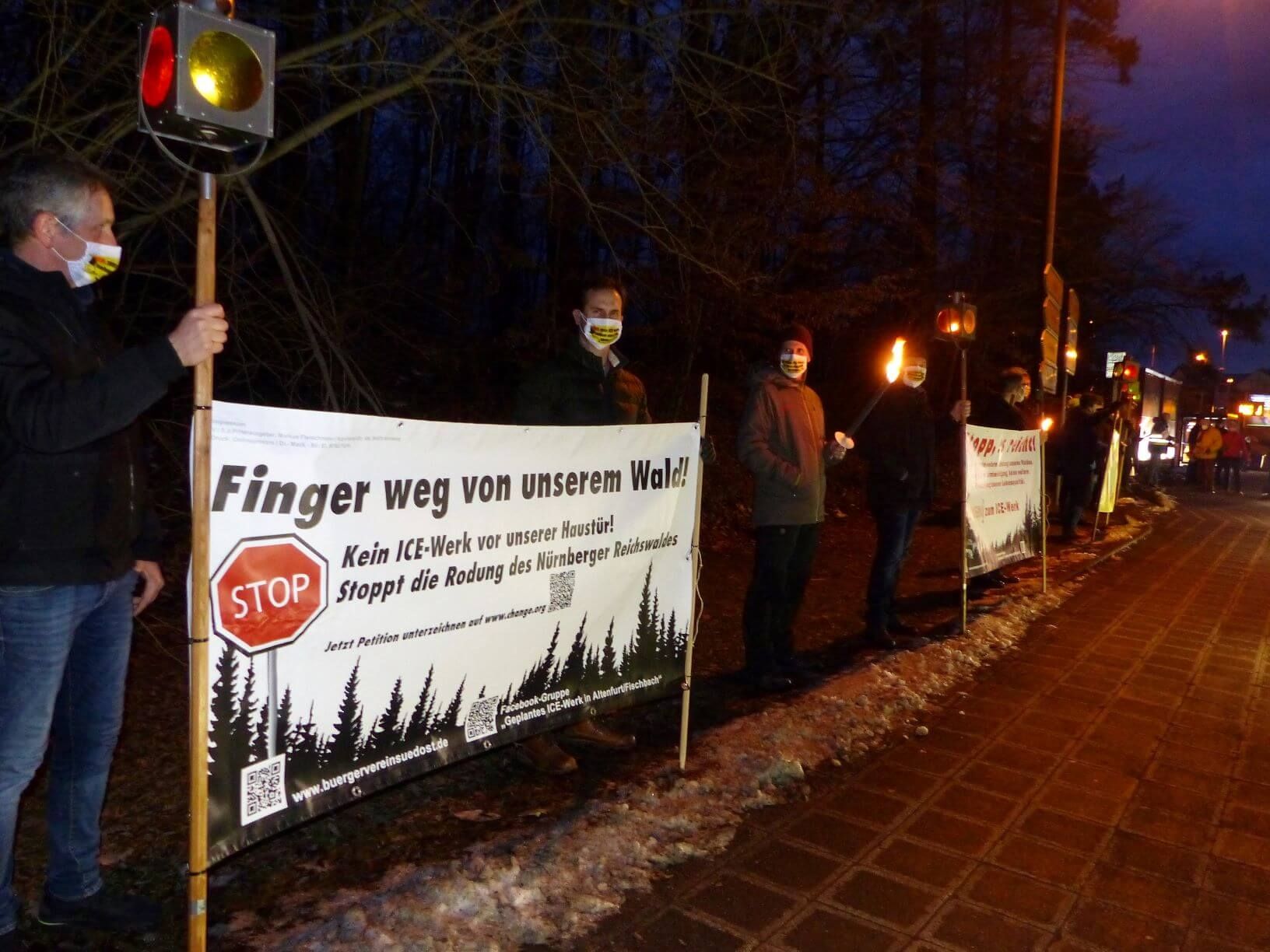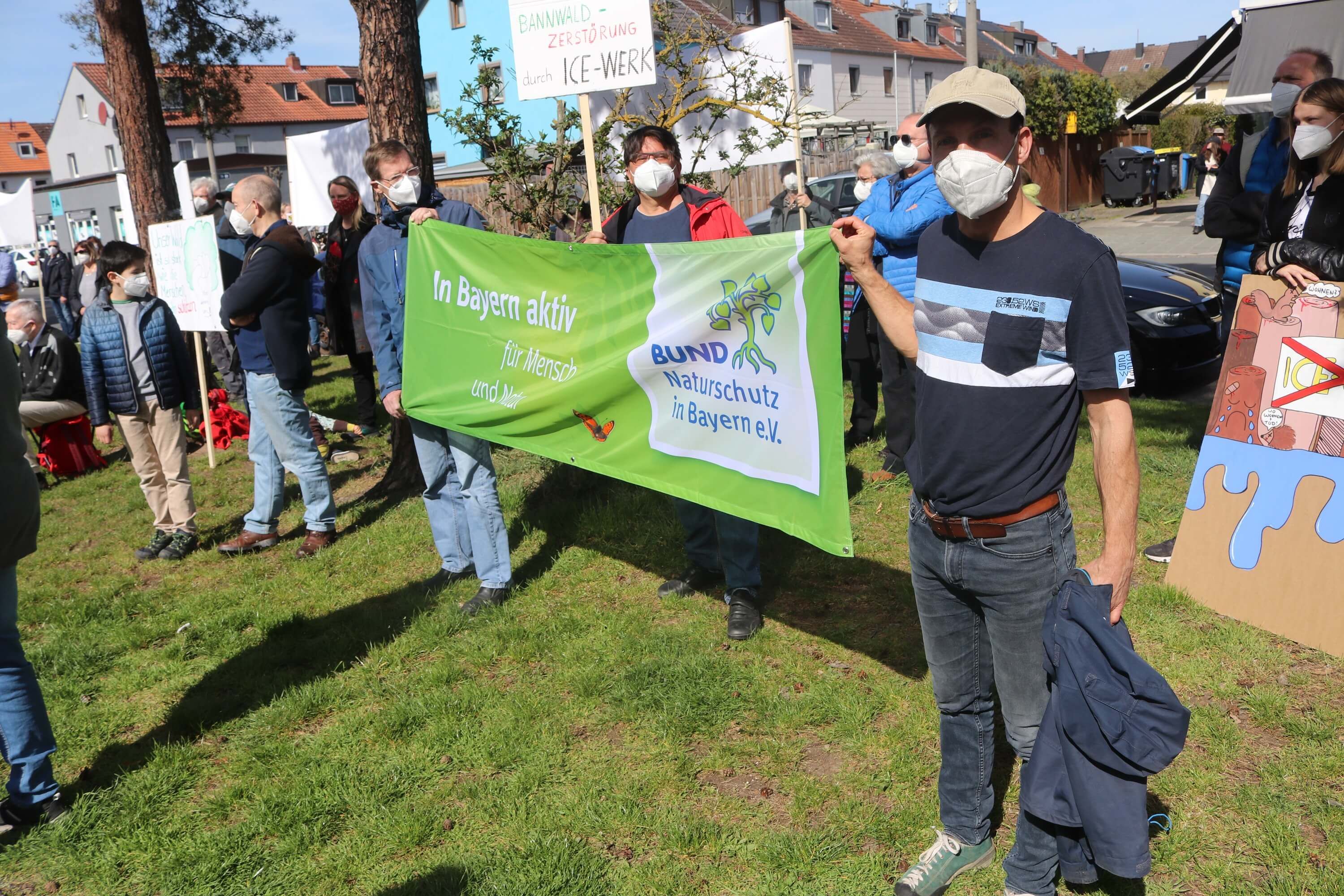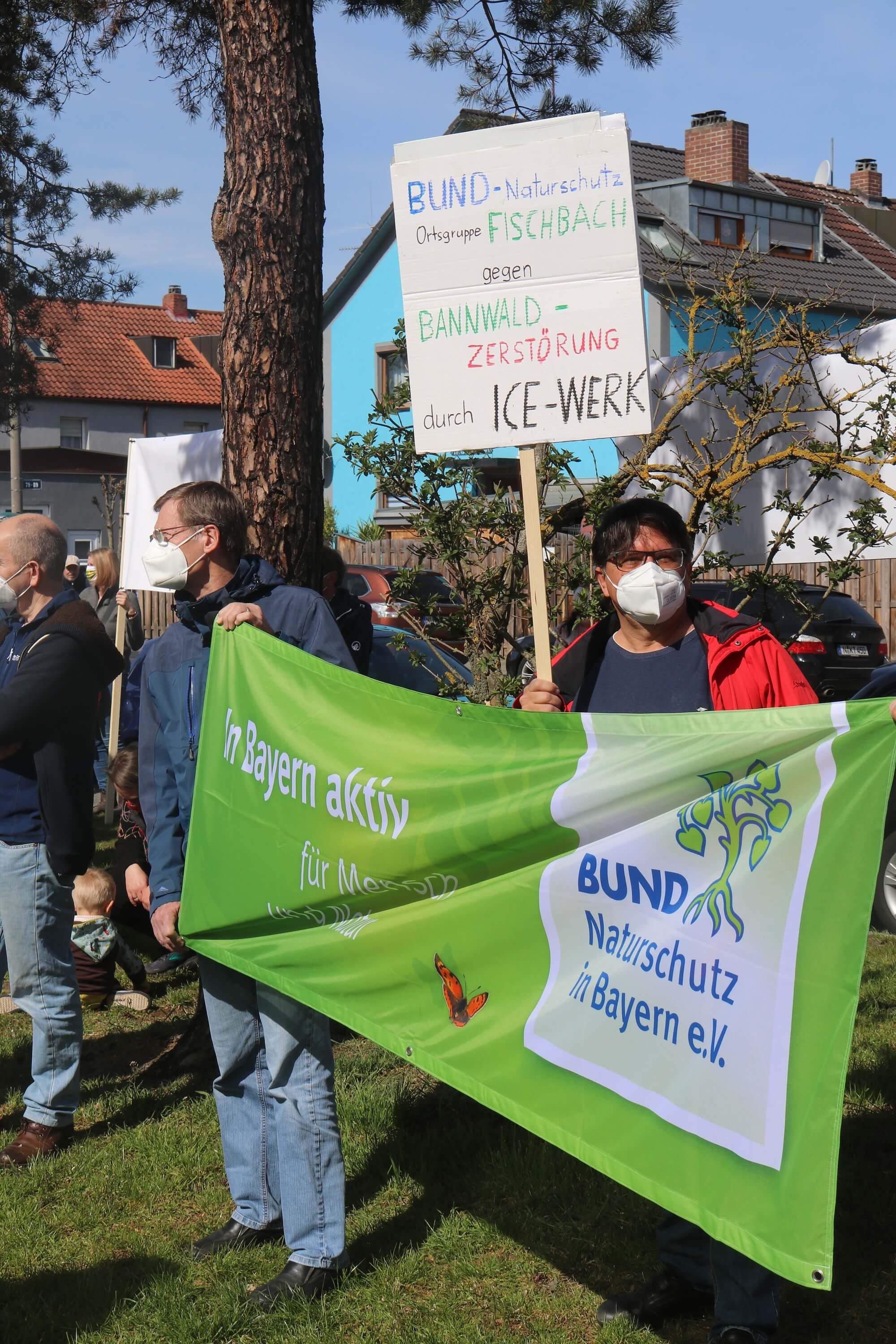Viele BN-Mitglieder beteiligten sich am Samstag, den 20. März mit großformatigen Transparenten an der Demonstration gegen das ICE-Werk im Reichswald zwischen Fischbach und Altenfurt. Darunter waren nicht nur Vertreter der Kreisgruppe, sondern auch der benachbarten Ortsgruppen Langwasser und Fischbach. Insgesamt wurden – bei stark beschränktem Zugang – etwa 190 TeilnehmerInnen gezählt. VertreterInnen von Bürgerverein, Bürgerinitiative und BN wiesen in ihren Redebeiträgen auf den drohenden Verlust von weit über 400.000 Quadratmetern Waldfläche hin.