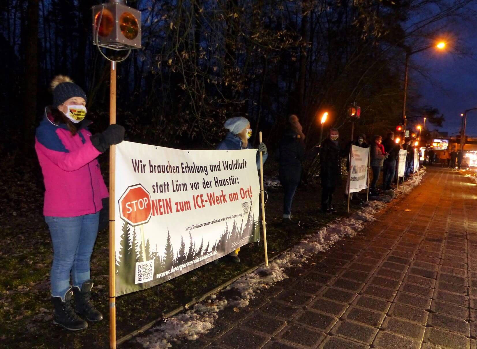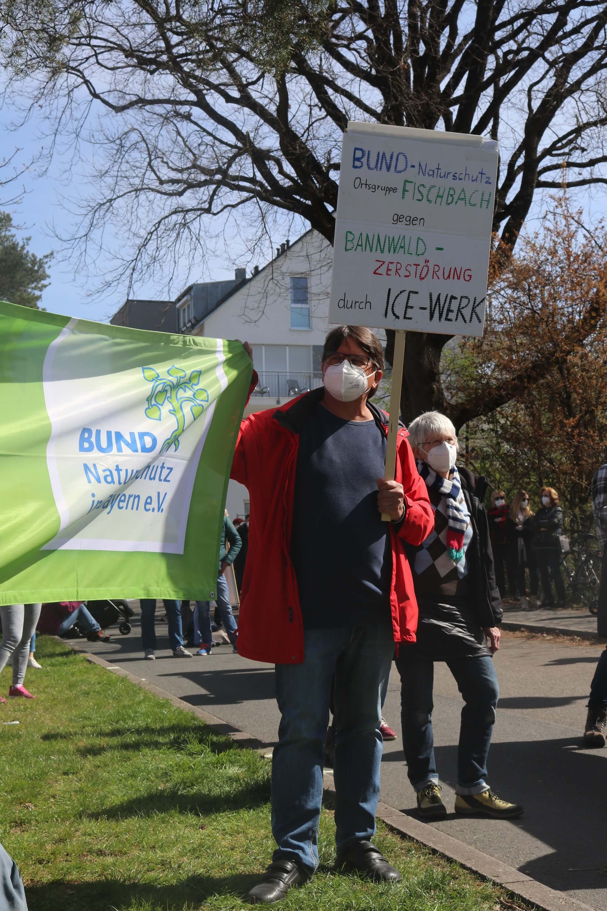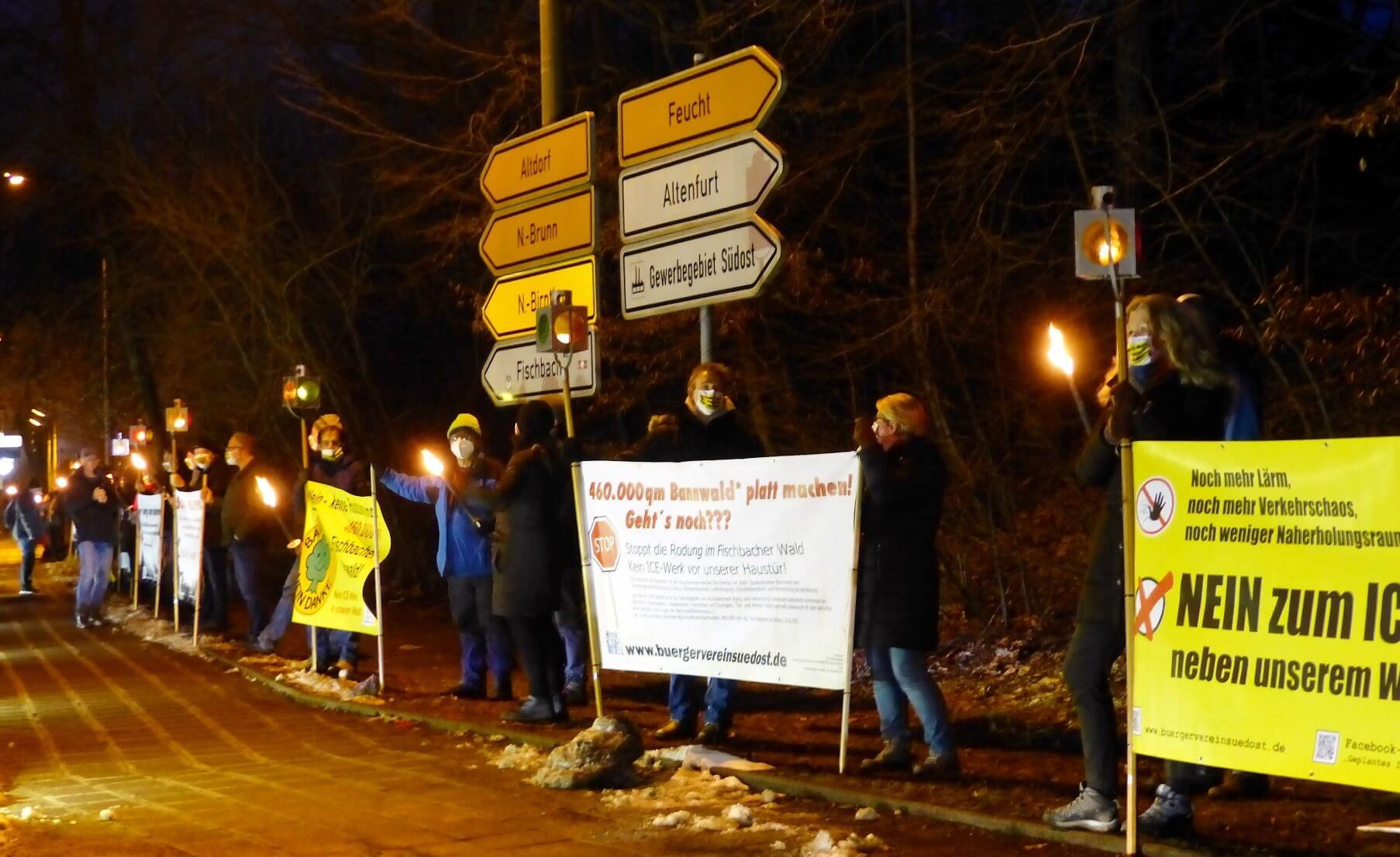 Viele BN-Mitglieder beteiligten sich am Samstag, den 20. März mit großformatigen Transparenten an der Demonstration gegen das ICE-Werk im Reichswald zwischen Fischbach und Altenfurt. Darunter waren nicht nur Vertreter der Kreisgruppe, sondern auch der benachbarten Ortsgruppen Langwasser und Fischbach. Insgesamt wurden – bei stark beschränktem Zugang – etwa 190 TeilnehmerInnen gezählt. VertreterInnen von Bürgerverein, Bürgerinitiative und BN wiesen in ihren Redebeiträgen auf den drohenden Verlust von weit über 400.000 Quadratmetern Waldfläche hin.