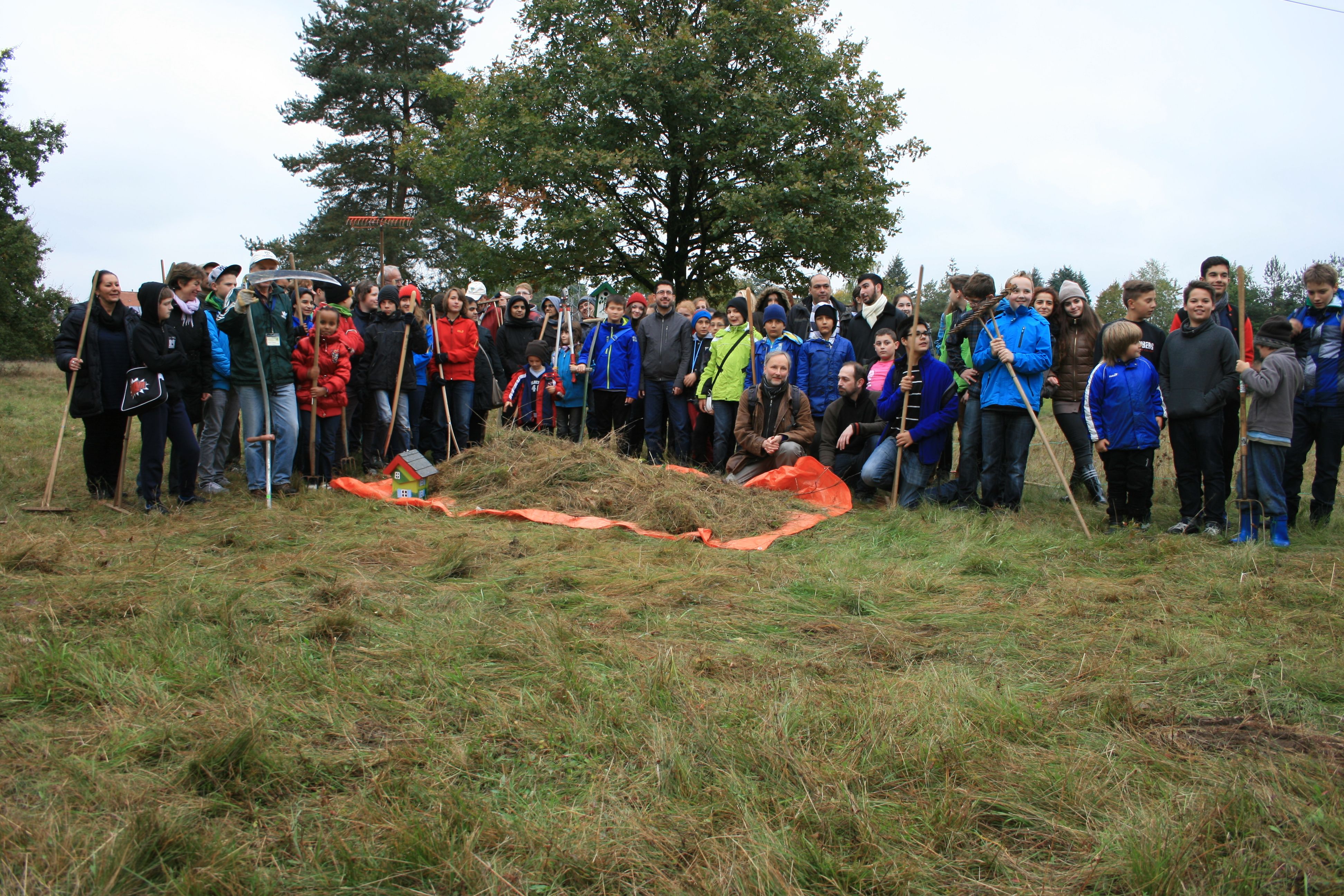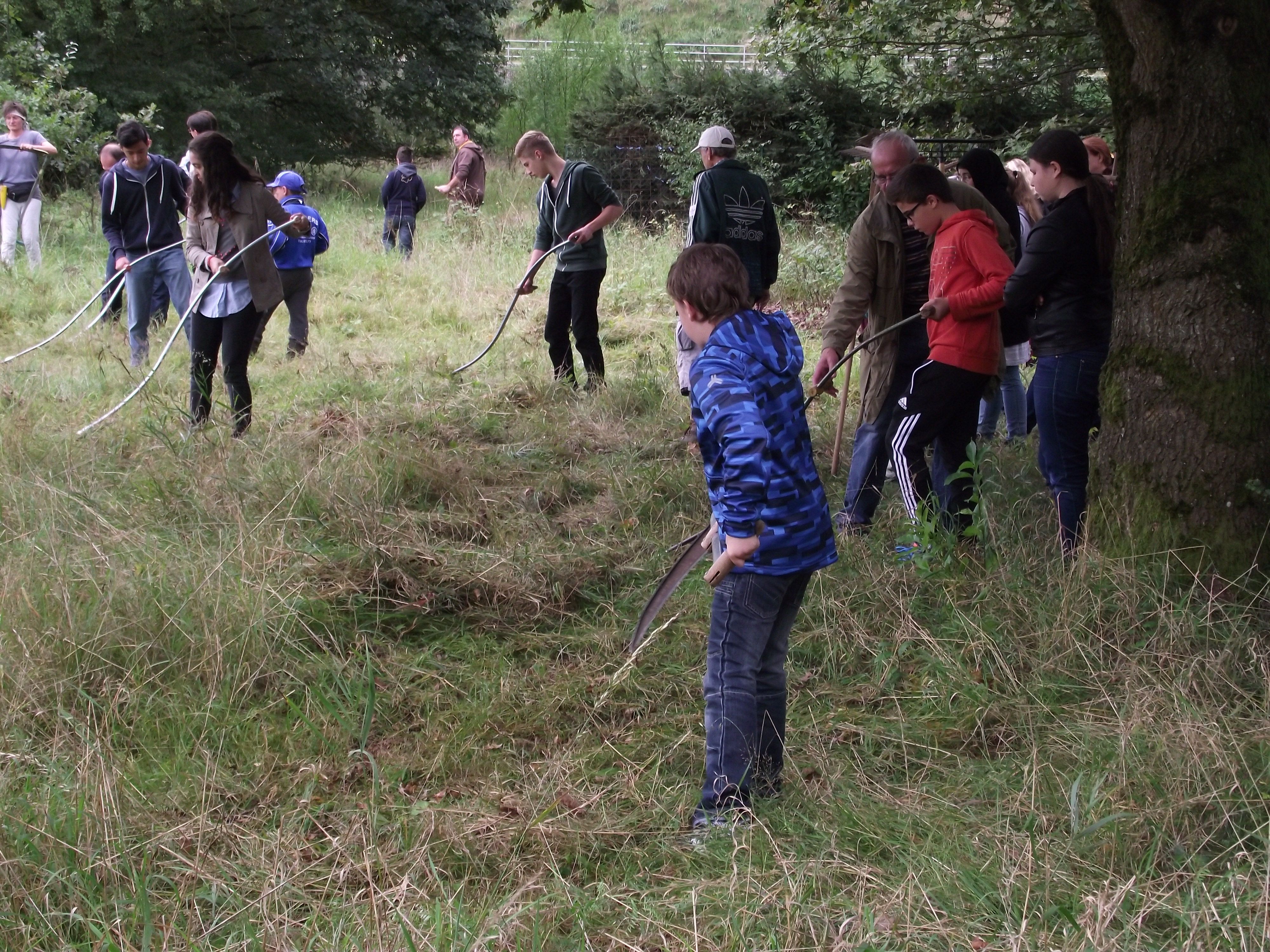 Gemeinsam wird ein kleines Biotop im Mosaik der Flächen mit Sensen gemäht. Dann sammeln die Aktiven das Mähgut mit Rechen und Heugabeln. Dank der schonenden Pflege gedeihen hier unzählige geschützte Blumen wie Sandgrasnelke, Bergsandglöckchen und Sandthymian. Bunte Heidenelken, Feuerfalter und Zauneidechsen danken den Einsatz ebenfalls.