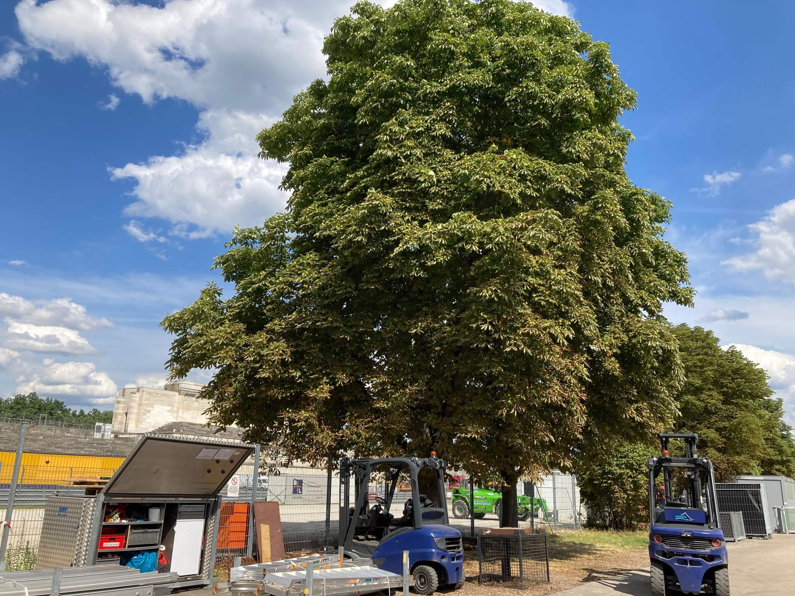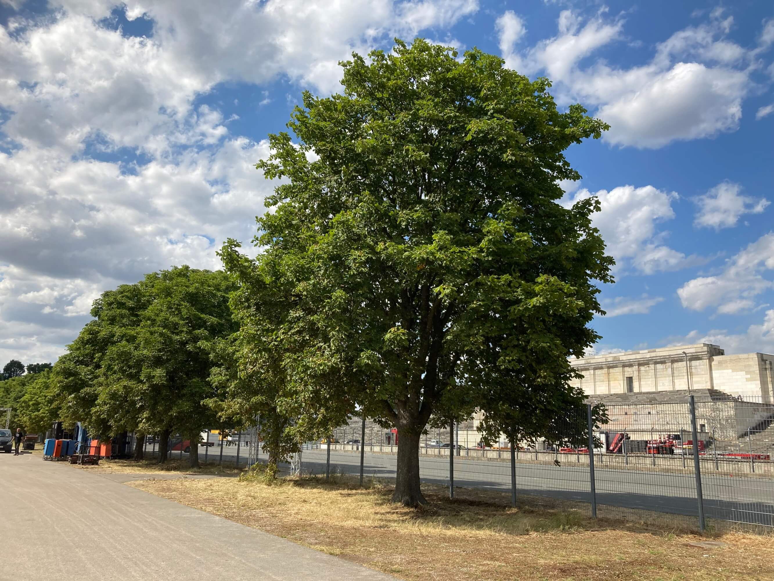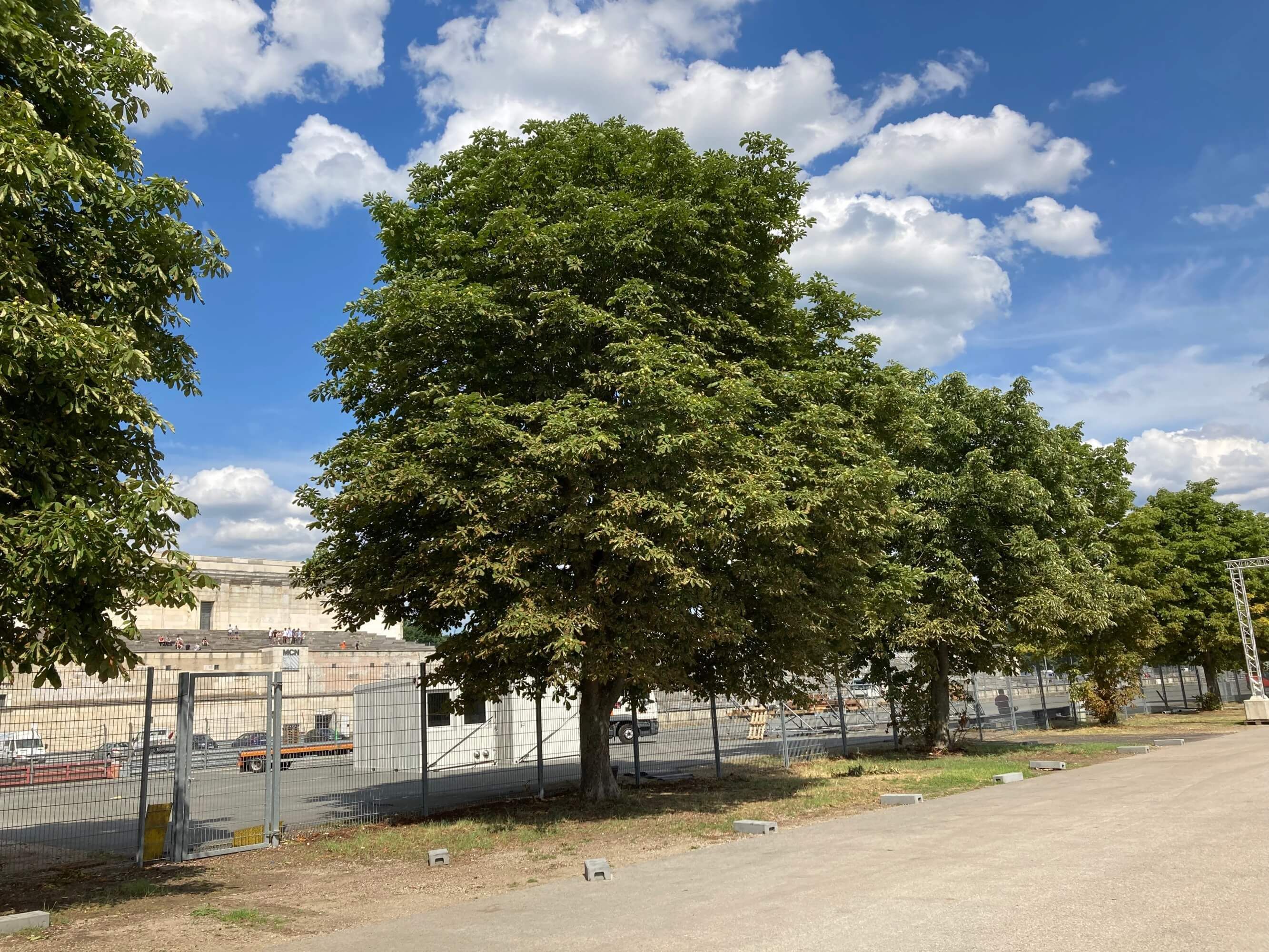 Das Zeppelinfeld wird im Norden an der Beuthener Straße von einer langen Reihe mit etwa 20 Rosskastanien begrenzt. Diese will die Stadt Nürnberg nun entfernen.